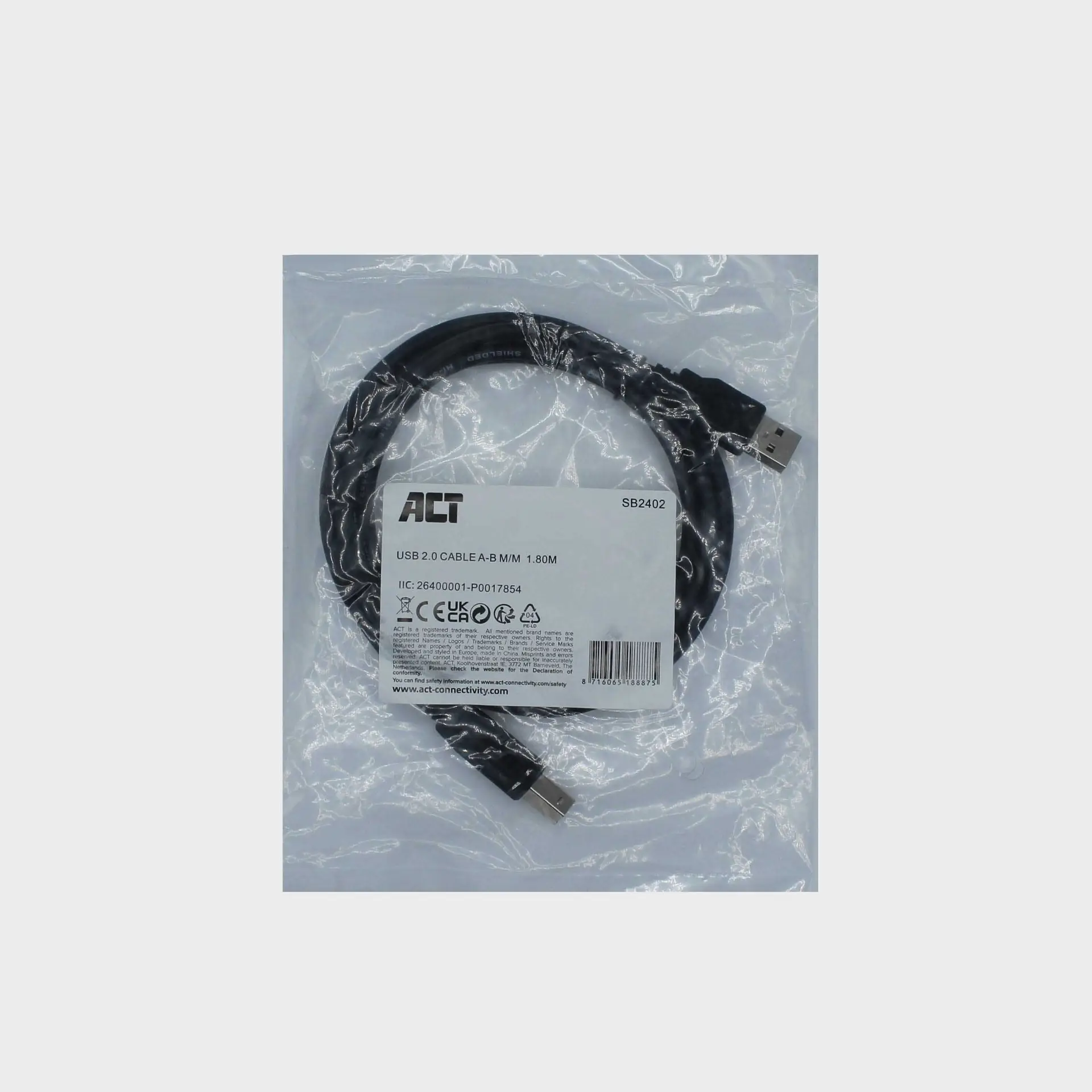 USB-A – USB-B -kaapeli, pituus 1,8 metriä.